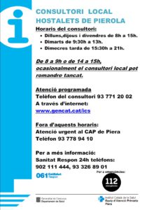 A continuació els horaris actualitzats, dades i telèfon de contacte del Consultori mèdic dels Hostalets de Pierola.