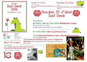 Els actes s’iniciaran dimarts amb l’entrega dels premis del VI Jocs Florals de l’Escola Renaixença. Continuaran el divendres, 22 amb un conta contes al Biblio@ccés i seguiran, de manera molt especial el dia de Sant Jordi amb llibres al carrer, espectacle familiar i presentació del llibre “La Carla, el Jan i la Llegenda de Sant Jordi.