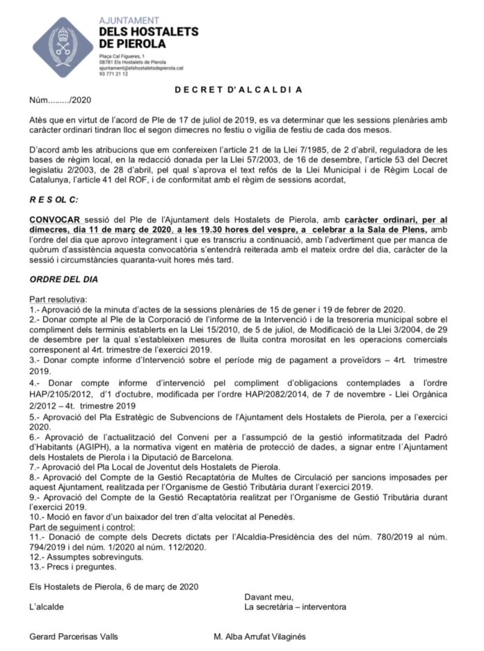 11 març. Ple Ordinari 11 de març de 2020 454 Compartir a facebook Piular a twitter When 11/03/2020 19:30 - 22:00 Add To Calendar Download ICS Google Calendar iCalendar Office 365 Outlook Live Where Auditori de Cal Figueres Plaça Cal Figueres 1, Hostalets de Pierola Event Type Esdeveniments Informació municipal Loading Map.... Auditori de Cal FigueresPlaça Cal Figueres 1 - Hostalets de PierolaEvents 41.5348287 1.7685406000000512