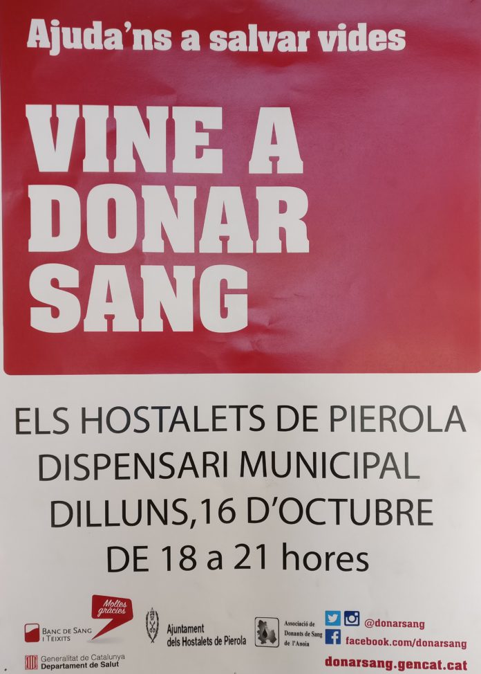 Nou acapte de sang als Hostalets de Pierola el proper dilluns, 16 d’octubre al dispensari mèdic de 18h a 21h.