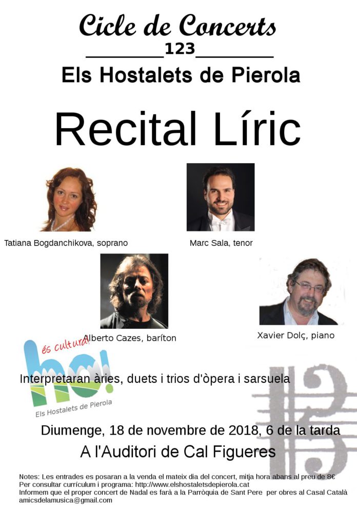 18 novembre. Rectital líric dels Amics de la Música 18 de novembre de 2018 614 Compartir a facebook Piular a twitter When 18/11/2018 18:00 - 20:00 Add To Calendar Download ICS Google Calendar iCalendar Office 365 Outlook Live Where Auditori Cal Figueres Plaça Cal Figueres 1, Hostalets de Pierola Event Type Cultura Esdeveniments newsletter música Map Unavailable Més informació aquí.