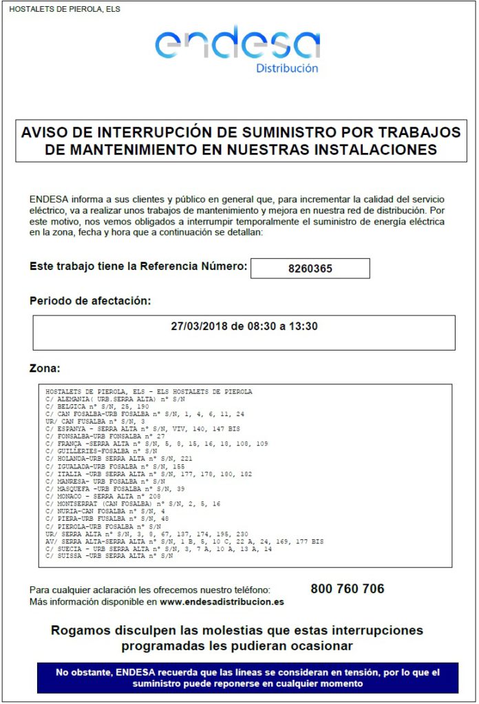 Interrupció subministrament de llum per part de l’empresa Endesa el dimarts, 27 de març entre les 8.30h i les 13.30h.