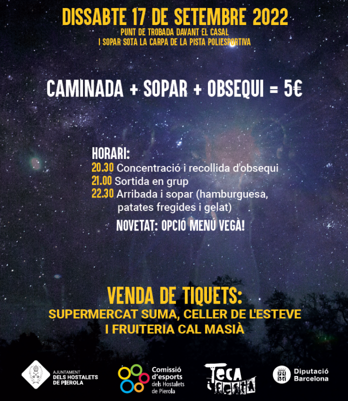 Caminada Nocturna 17 de setembre de 2022 636 Compartir a facebook Piular a twitter When 17/09/2022 20:30 - 23:30 Add To Calendar Download ICS Google Calendar iCalendar Office 365 Outlook Live Where C. Isidre Vallès Carrer Isidre Vallès, Els Hostalets de Pierola Event Type Esdeveniments Esport newsletter Map Unavailable