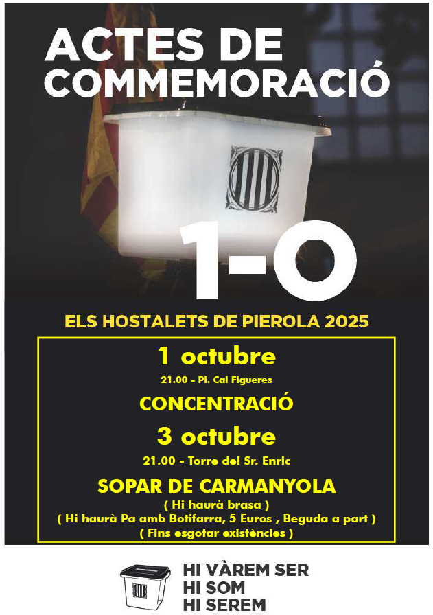 Concentració 1 d'octubre de 2025 3 Compartir a facebook Piular a twitter When 01/10/2025 21:00 - 21:30 Add To Calendar Download ICS Google Calendar iCalendar Office 365 Outlook Live Where Plaça Cal Figueres Davant l'Ajuntament, Els Hostalets de Pierola Event Type Entitats Esdeveniments Map Unavailable
