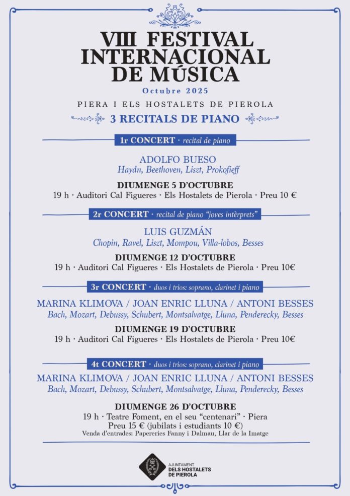 3r Concert FIM 2025 19 d'octubre de 2025 26 Compartir a facebook Piular a twitter When 19/10/2025 19:00 - 20:30 Add To Calendar Download ICS Google Calendar iCalendar Office 365 Outlook Live Where Auditori Cal Figueres Plaça Cal Figueres 1, Hostalets de Pierola Event Type Esdeveniments Map Unavailable