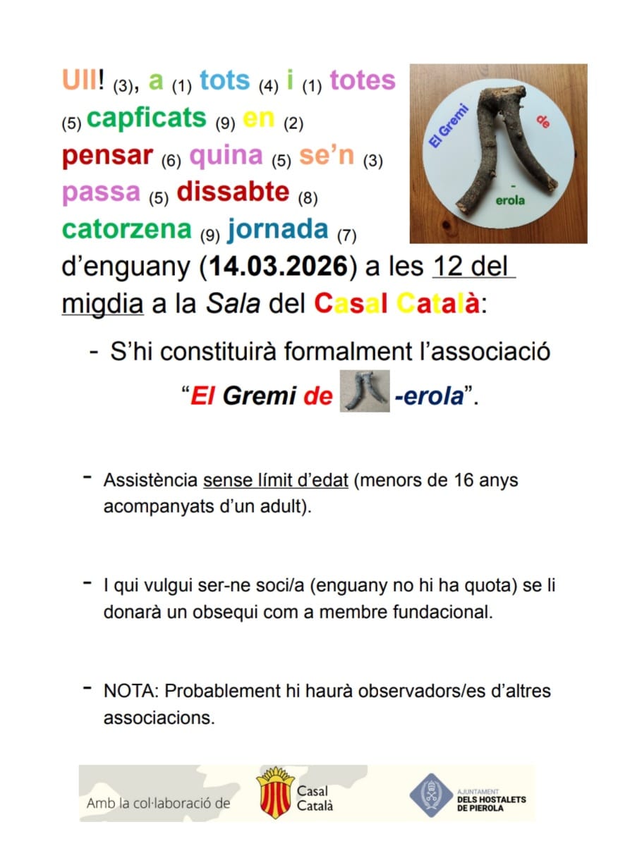 Fundació del gremi de PI-erola 14 de març de 2026 4 Compartir a facebook Piular a twitter When 14/03/2026 12:00 - 13:00 Add To Calendar Download ICS Google Calendar iCalendar Office 365 Outlook Live Where Teatre del Casal Català Av. Catalunya, Els Hostalets de Pierola Event Type Cultura Entitats Esdeveniments Map Unavailable