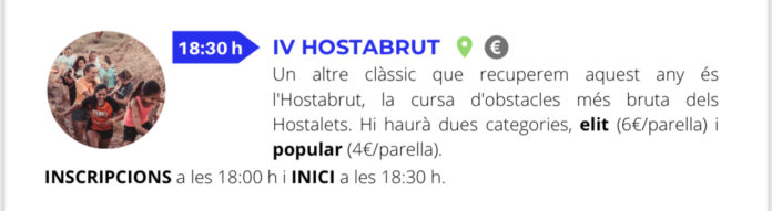 IV Hostabrut SJ22 11 d'agost de 2022 245 Compartir a facebook Piular a twitter When 11/08/2022 18:30 - 20:30 Add To Calendar Download ICS Google Calendar iCalendar Office 365 Outlook Live Event Type Cultura Esdeveniments Esport Estiu Festes Joventut newsletter