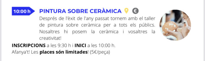 Pintura sobre ceràmica SJ22 11 d'agost de 2022 292 Compartir a facebook Piular a twitter When 11/08/2022 10:00 - 12:30 Add To Calendar Download ICS Google Calendar iCalendar Office 365 Outlook Live Event Type Cultura Esdeveniments Estiu Festes Joventut newsletter