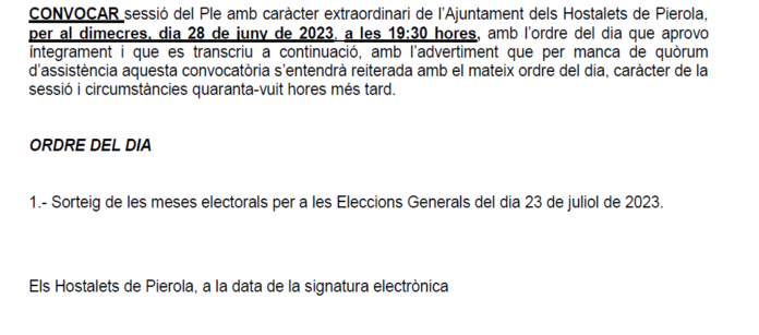 Ple extraordinari 28 de juny de 2023 244 Compartir a facebook Piular a twitter When 28/06/2023 19:30 - 20:00 Add To Calendar Download ICS Google Calendar iCalendar Office 365 Outlook Live Event Type Esdeveniments Informació municipal