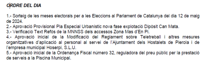 Ple extraordinari 15 d'abril de 2024 216 Compartir a facebook Piular a twitter When 15/04/2024 18:00 - 19:00 Add To Calendar Download ICS Google Calendar iCalendar Office 365 Outlook Live Where Auditori Cal Figueres Plaça Cal Figueres 1, Hostalets de Pierola Event Type Esdeveniments Informació municipal Map Unavailable Dilluns 15 d’abril 18.00 Sessió extraordinària Auditori Cal Figueres