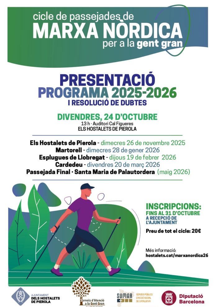 Reunió informativa Marxa Nòrdica 24 d'octubre de 2025 31 Compartir a facebook Piular a twitter When 24/10/2025 13:00 - 13:30 Add To Calendar Download ICS Google Calendar iCalendar Office 365 Outlook Live Where Auditori Cal Figueres Plaça Cal Figueres 1, Hostalets de Pierola Event Type Esdeveniments Gent Gran Informació municipal Map Unavailable