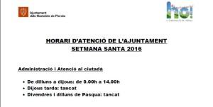 Anuncis oficials Horaris de l’Ajuntament durant la Setmana Santa 15 de març de 2016 1399 Compartir a facebook Piular a twitter