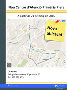 El nou CAP de Piera ja ha obert les seves portes i ha entrat en servei. Des del 21 de maig passat, la seva nova ubicació és a l’Avinguda Carretera d’Igualada, 62.