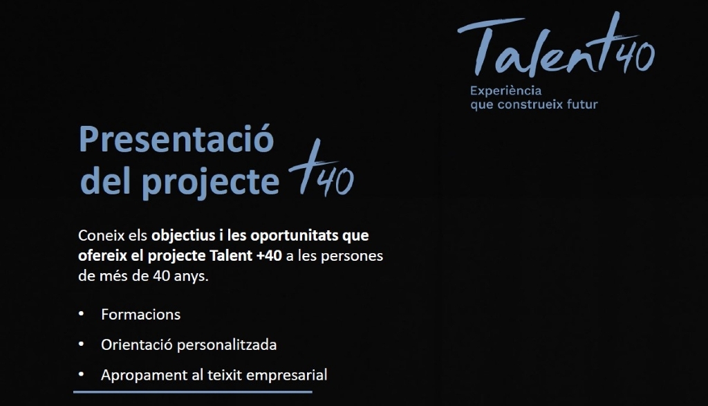 Talent +40 busca posar en valor l’experiència i els coneixements de les persones amb trajectòria professional, oferint-los formacions, orientació personalitzada i un apropament al teixit empresarial per facilitar-ne la inserció laboral.