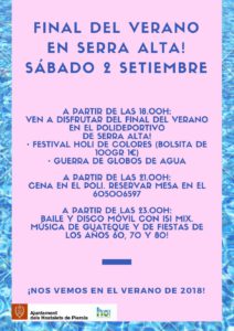 L’Associació de Veïns de Serra Alta i el ‘Polideportivo’ organitzen la Festa Final de l’Estiu aquest dissabte, 2 de setembre.